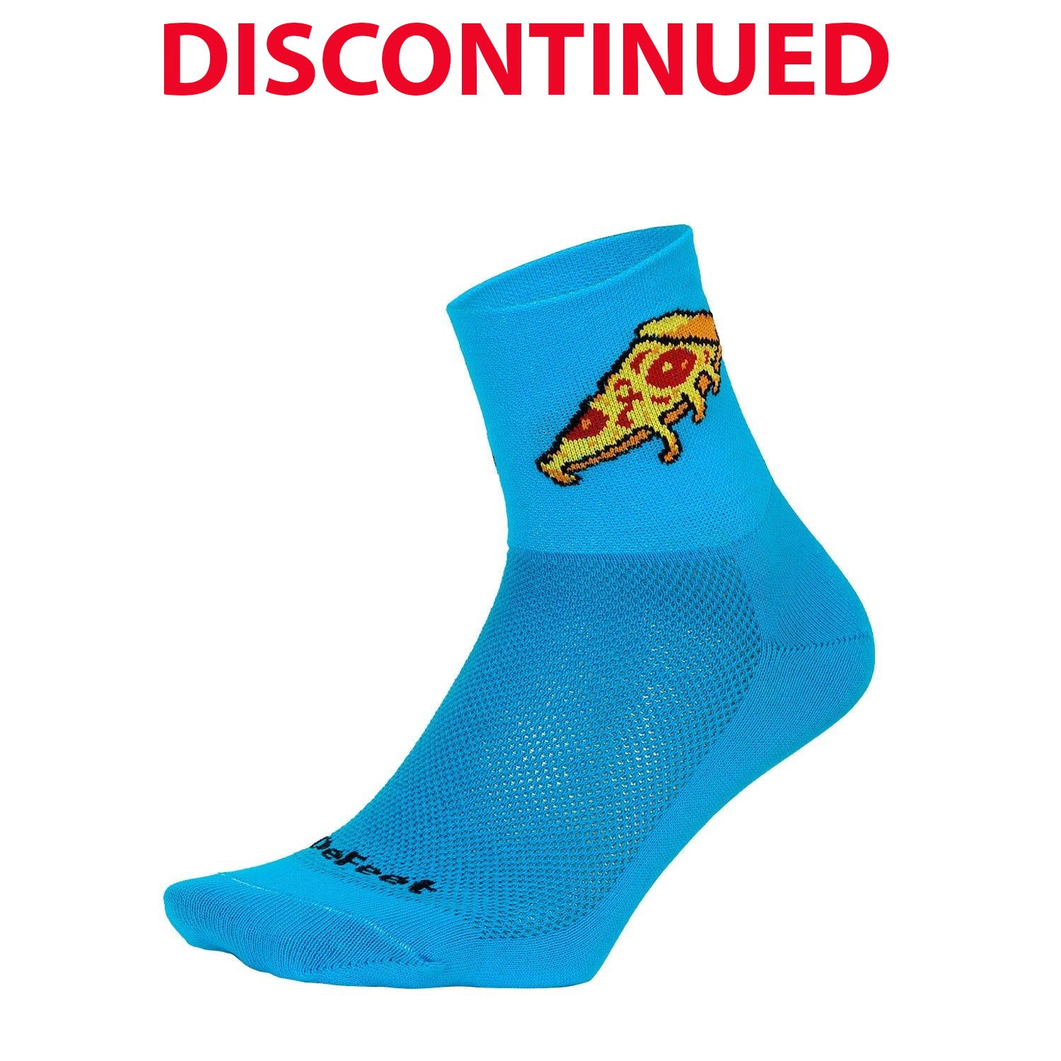 The Aireator 3" Pizza quarter cuff sock is in a bright process blue with a single cheesy slice of pepperoni pizza on either side of the double cuff.