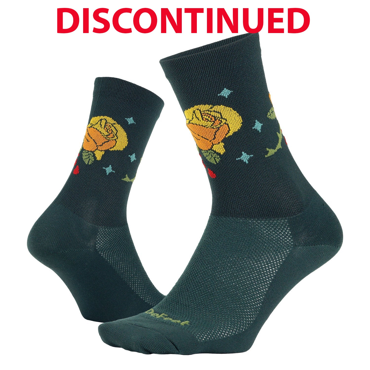 The Aireator Crew Thorny Rose is a forest green sock with a yellow and orange rose on the cuff, with drops of blood dripping from the thorns.