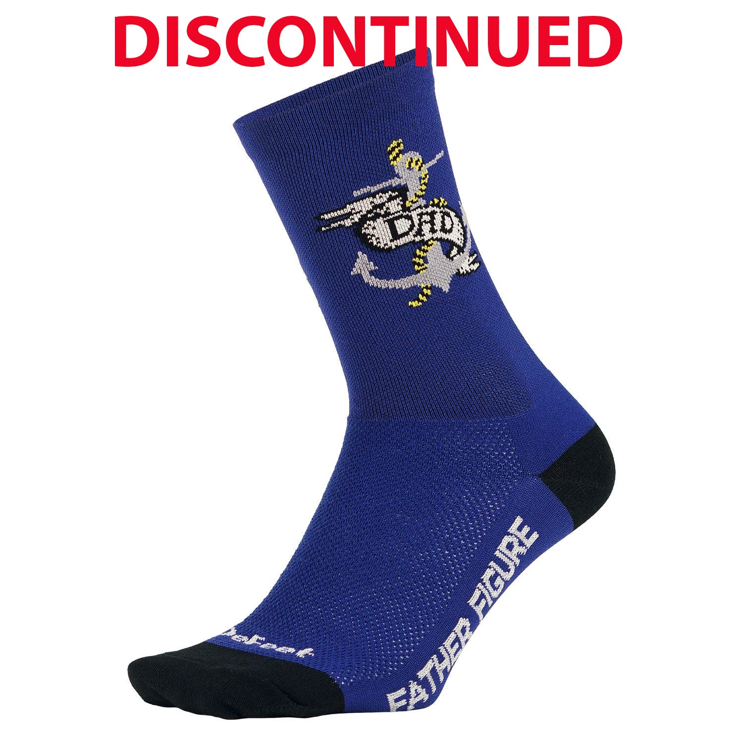 The Aireator Crew Love Dad is a classic light navy cycling sock with a vintage anchor tattoo with "Dad" in the banner. The foot features "Father Figure" on one side and "Dad Bod" on the other.
