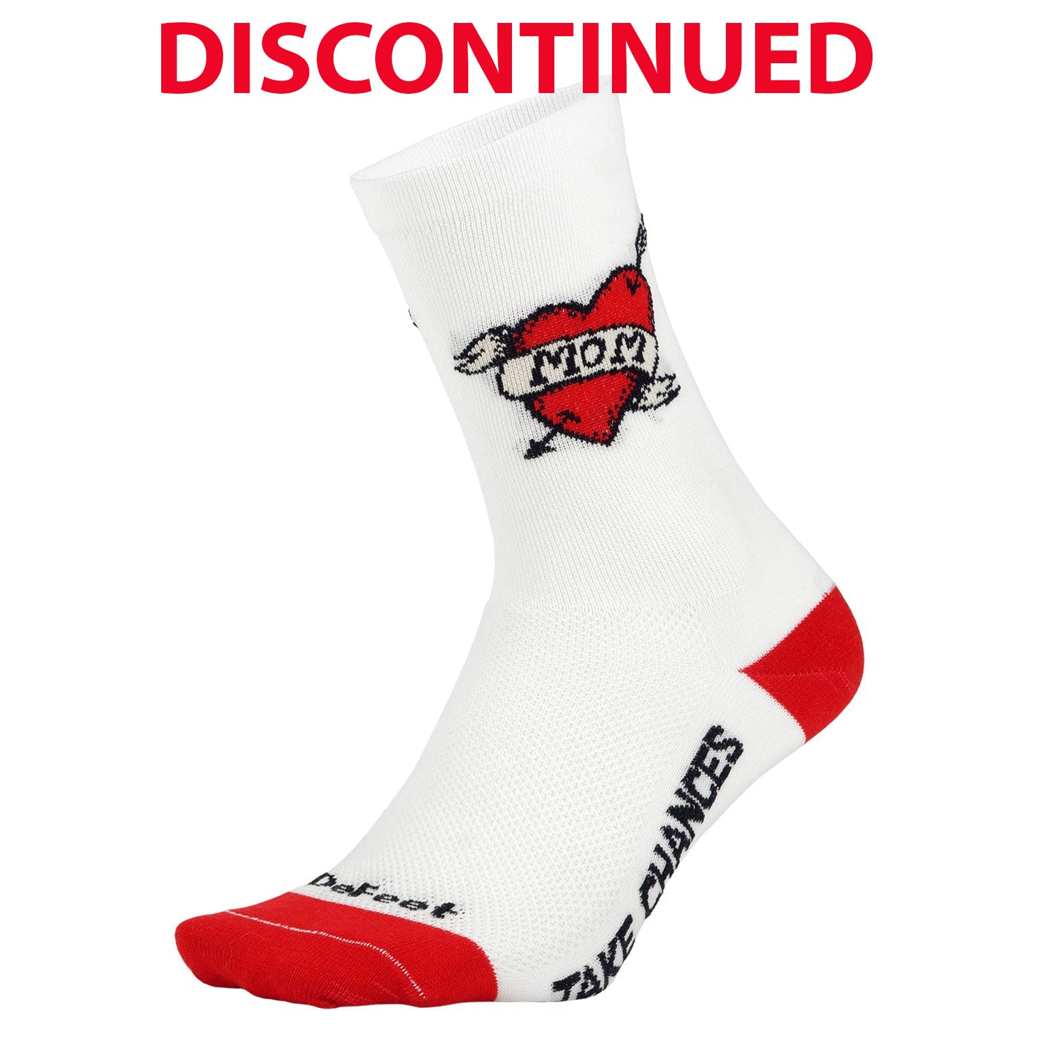 The Aireator Crew Love Mom is a classic white cycling sock with a vintage heart tattoo with "Mom" in the banner. The foot features the text "Ride Fast" on one side and "Take Chances" on the other.