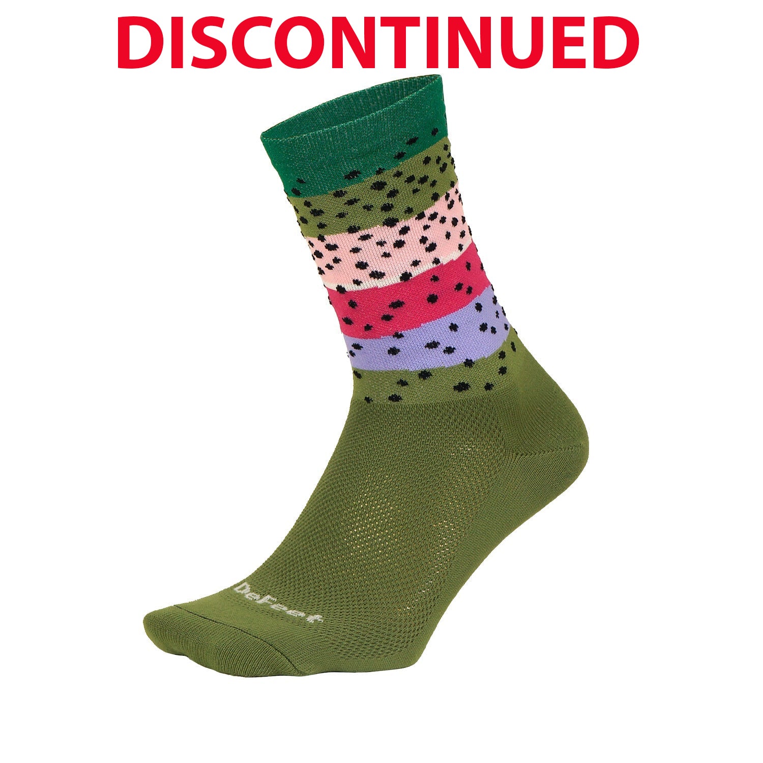 Aireator 6" Rainbow Trout crew sock is part of the Rainbow Trout Collection, designed to support local nonprofit dedicated to protecting Wilson Creek, NC. They are in a rainbow trout pattern and feature the phrase, “Keep it Clean.” www.defeet.com/pages/rainbow-trout