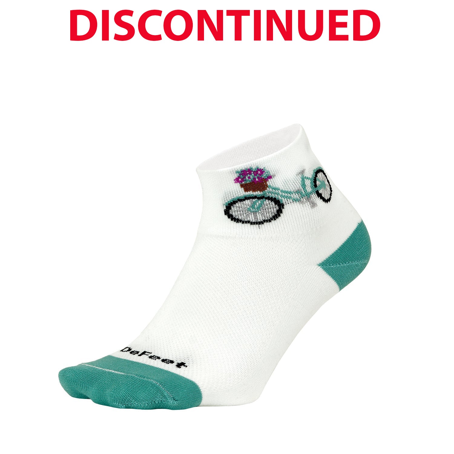The Aireator 2" Market Bike is a women's-specific fit high ankle sock in white with a teal heel and toe; the cuff features a teal cruiser bike with flowers in the bike basket. Designed for the female foot, the women's fit has less bulk and additional elasticity, so socks provide a compressive feel on the foot and won't bunch up in the shoe.