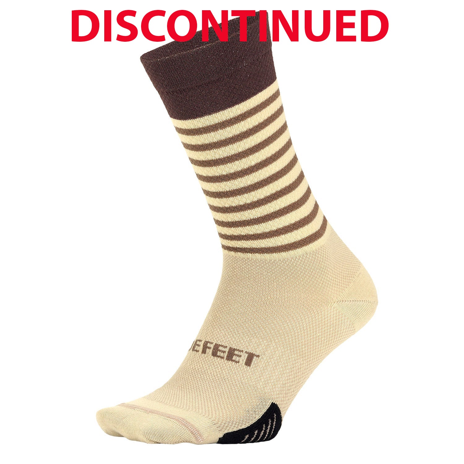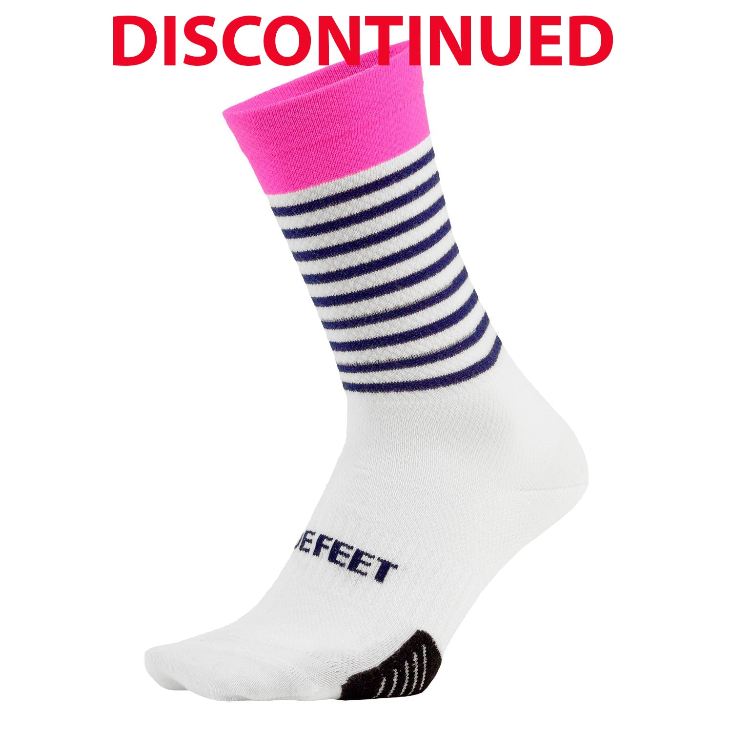 The Cyclismo 6" Sailor crew white cycling sock features a cuff of narrow stripes with a wide band at the top of the cuff. Available in white with navy stripes and a pink cuff band or khaki brown with light gold stripes.