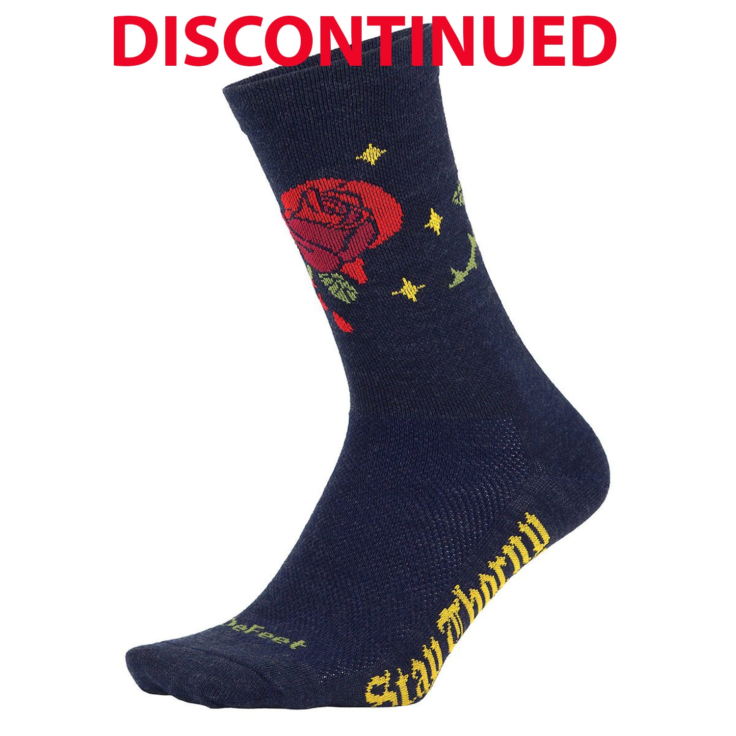 Wooleator 6" Thorny Rose crew athletic cycling sock features a red rose on a navy background with drops of blood dripping from the thorns and "Stay thorny" on the foot bottom.