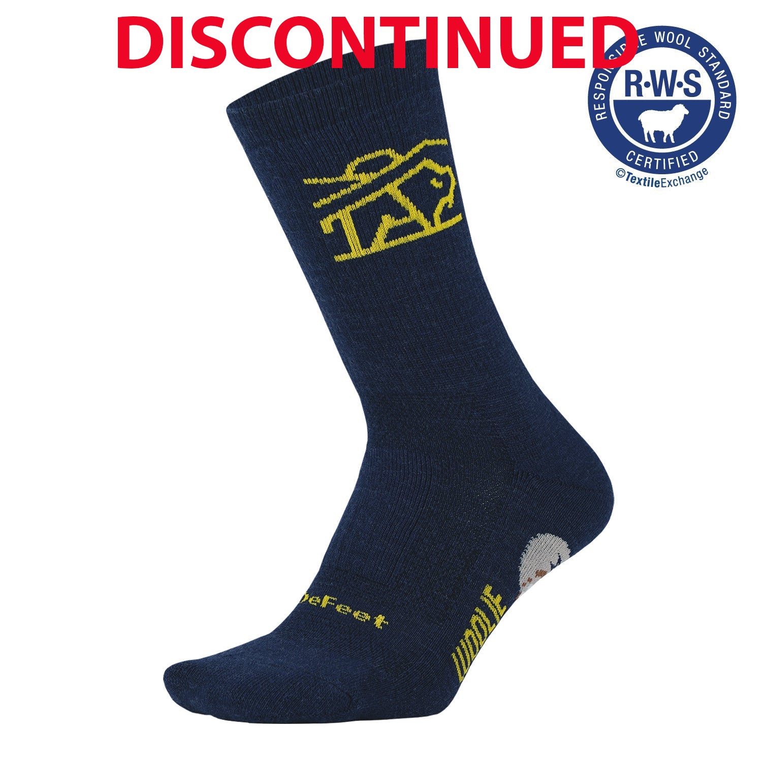 RWS certified Merino wool DeFeet Woolie Boolie socks with Yellowstone National Parks logo on the cuff