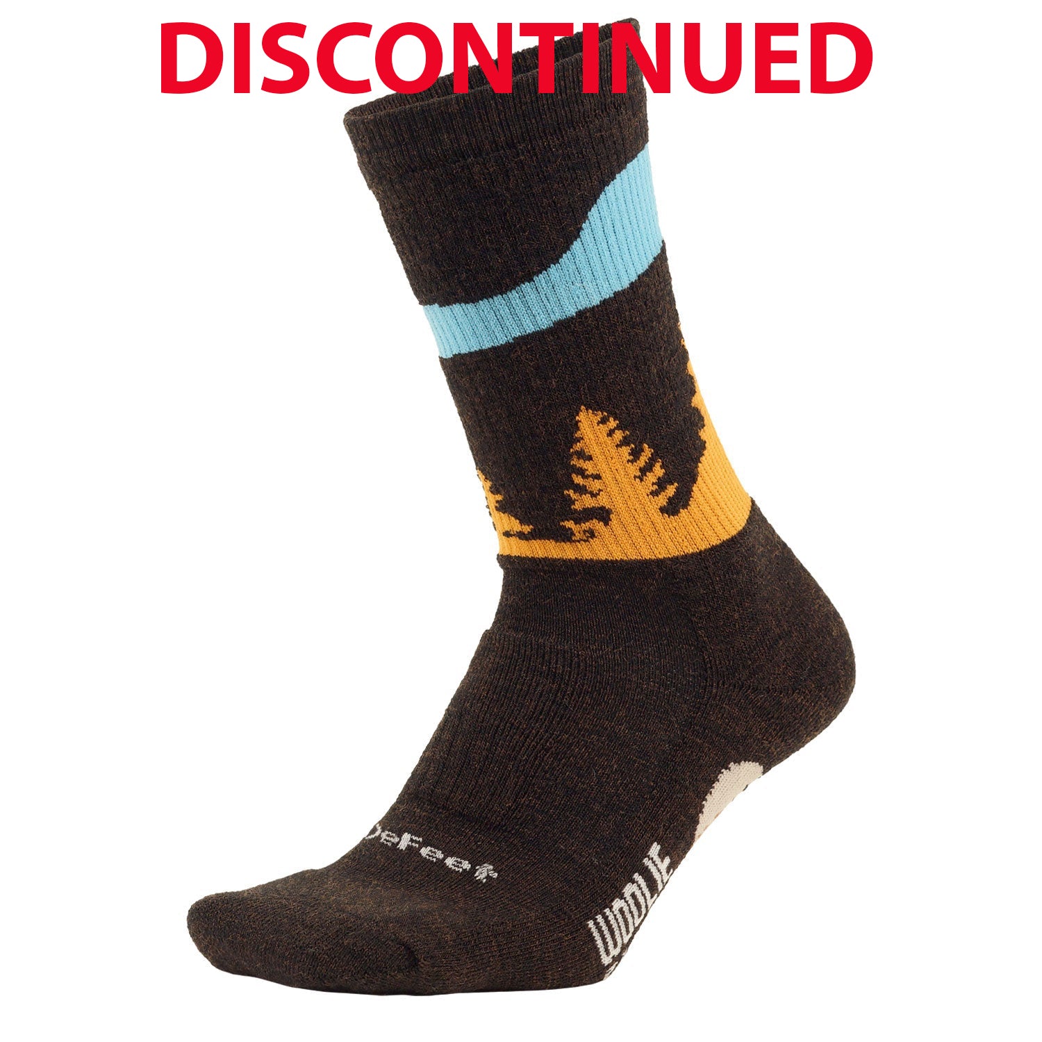 Woolie Boolie 6" Spruce is a thick wool ribbed crew sock featuring a wilderness scene of a treeline, mountains, and sky. Available in natural and chestnut brown.